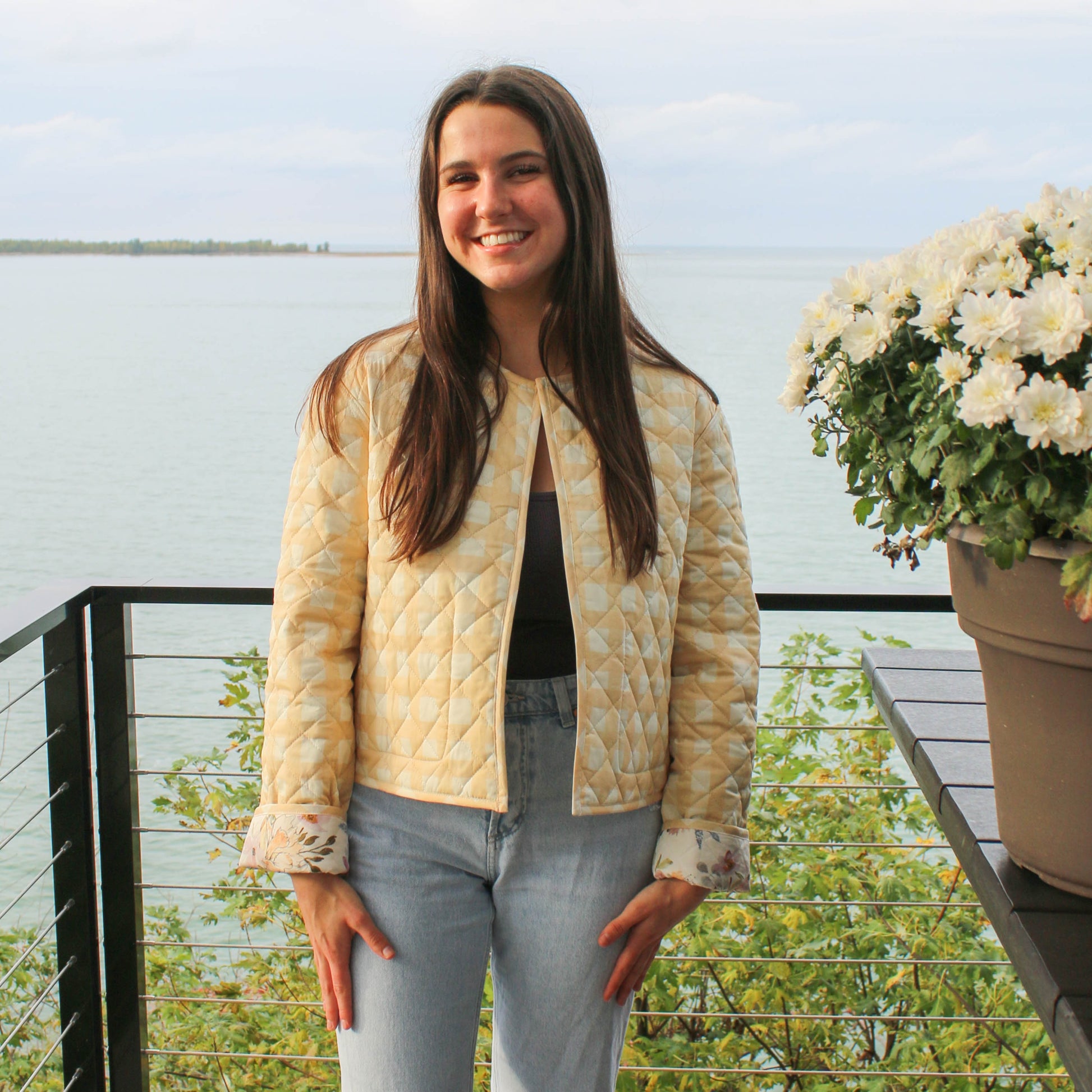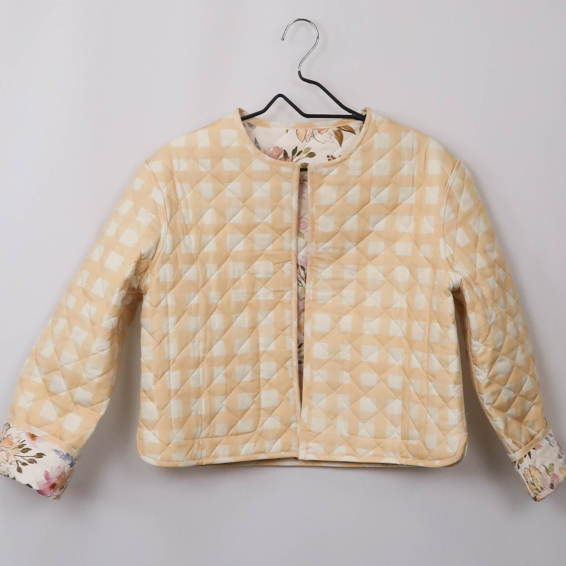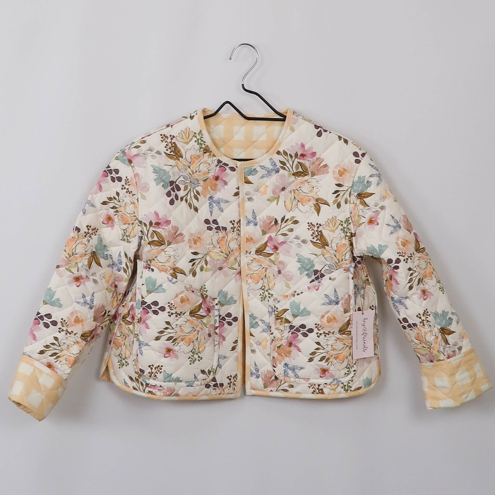 Our second collection from Hey Friends The Label is here! This reversible quilted jacket is proudly made in the USA. The floral and gingham fabric is from a family owned fabric mill in Pennsylvania. These jackets run on the bigger side, as most of our models sized down. Shaef is wearing her normal size, a small. This structured jacket is reversible- you can have your pick of the floral or gingham! p.s. the more you wear it, the more it will soften up :)