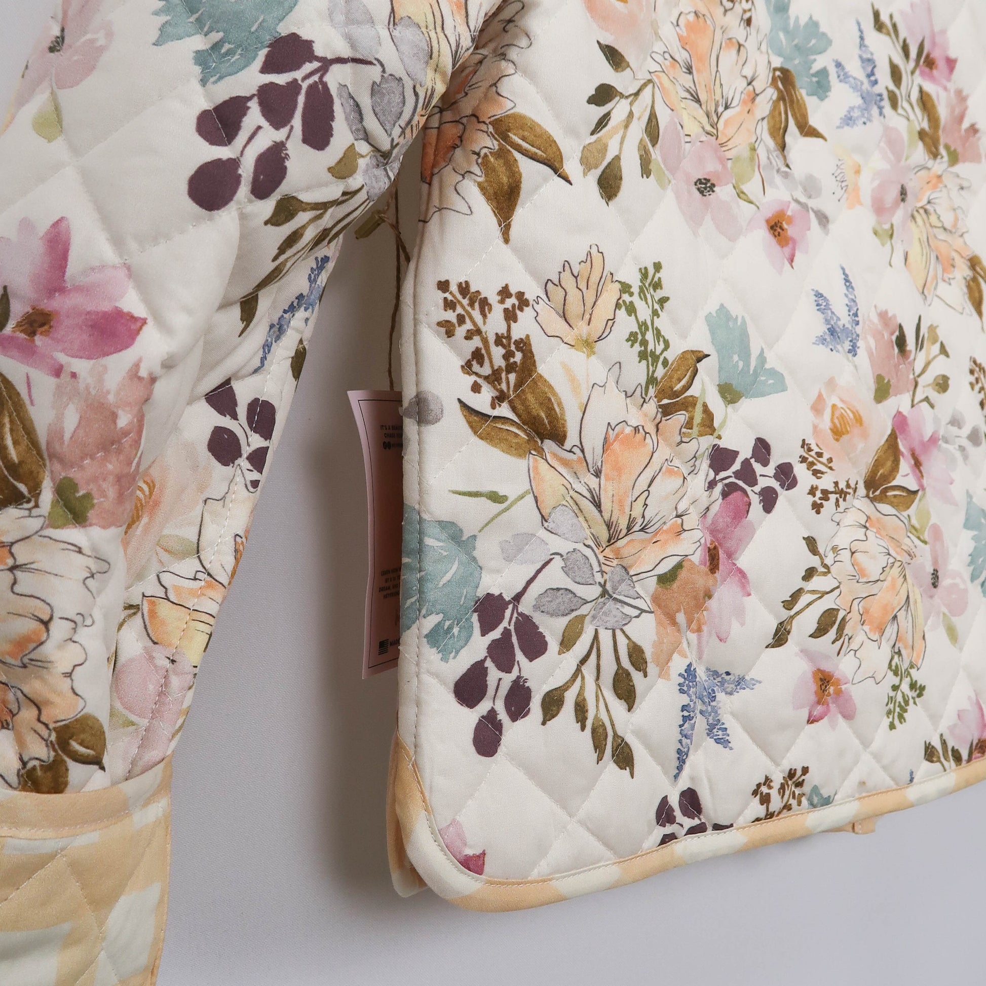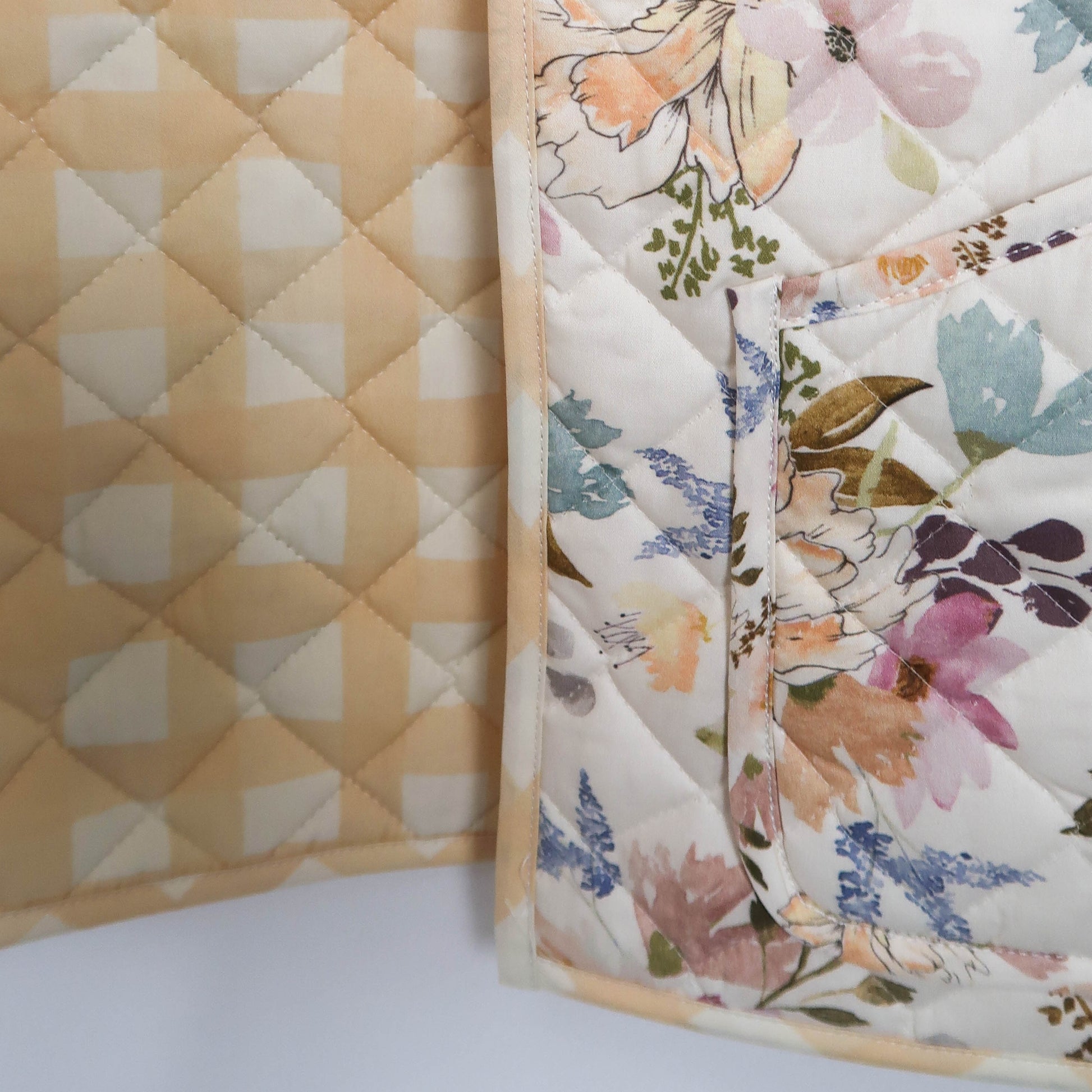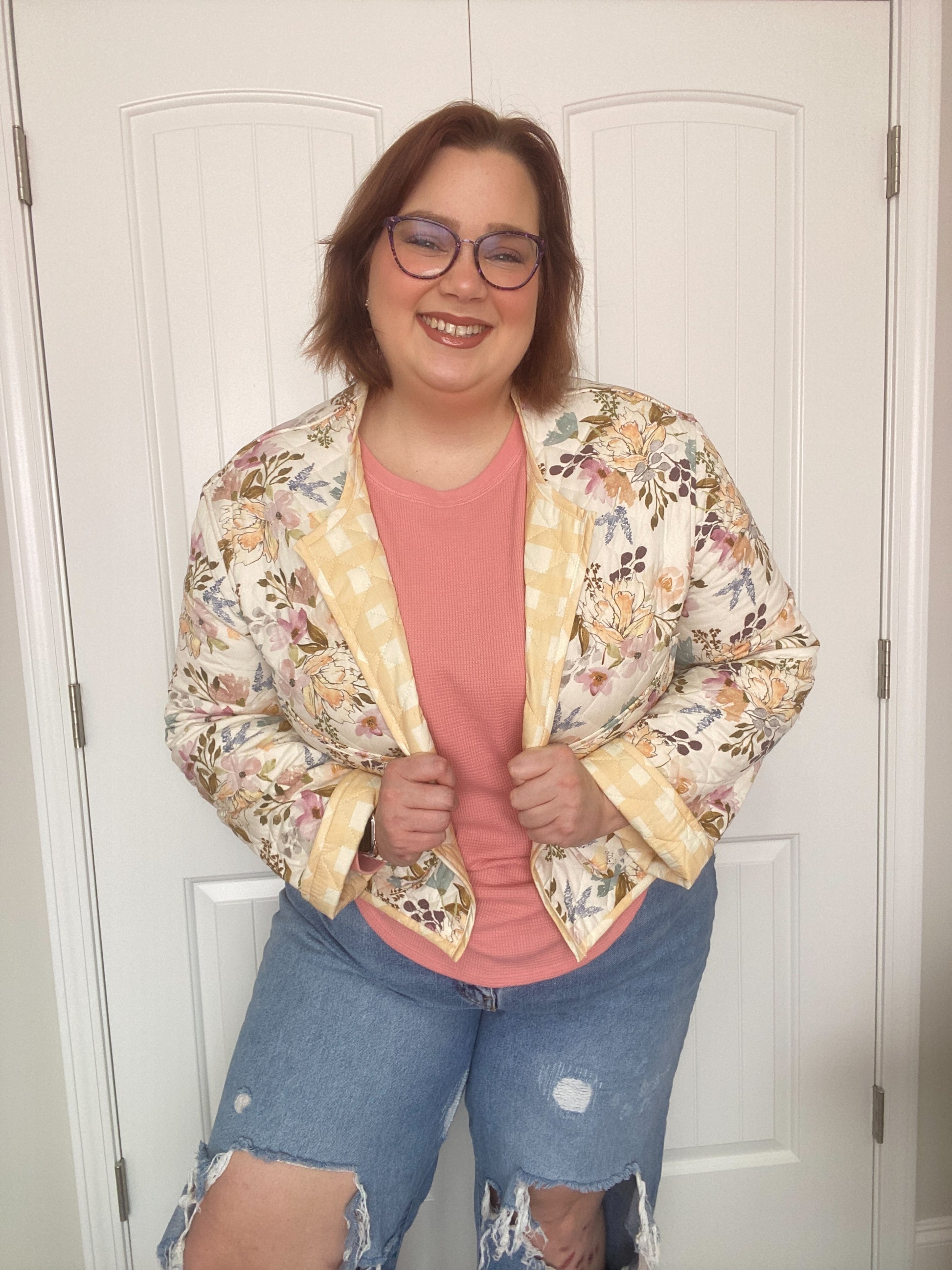 Our second collection from Hey Friends The Label is here! This reversible quilted jacket is proudly made in the USA. The floral and gingham fabric is from a family owned fabric mill in Pennsylvania. These jackets run on the bigger side, as most of our models sized down. Shaef is wearing her normal size, a small. This structured jacket is reversible- you can have your pick of the floral or gingham! p.s. the more you wear it, the more it will soften up :)