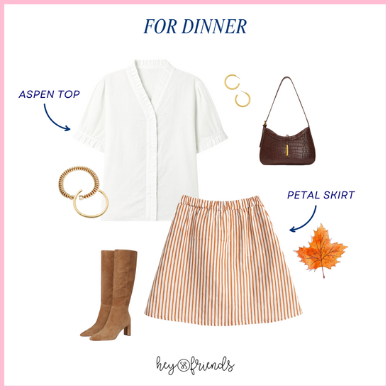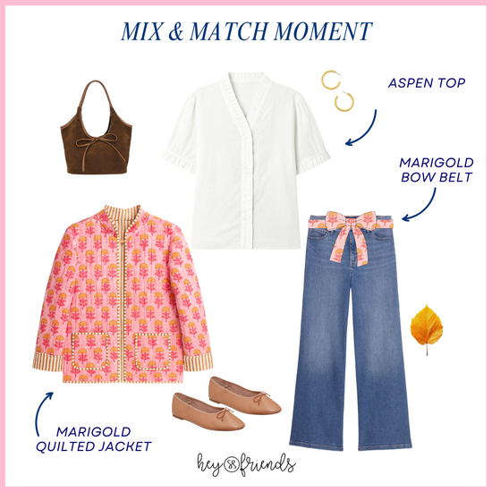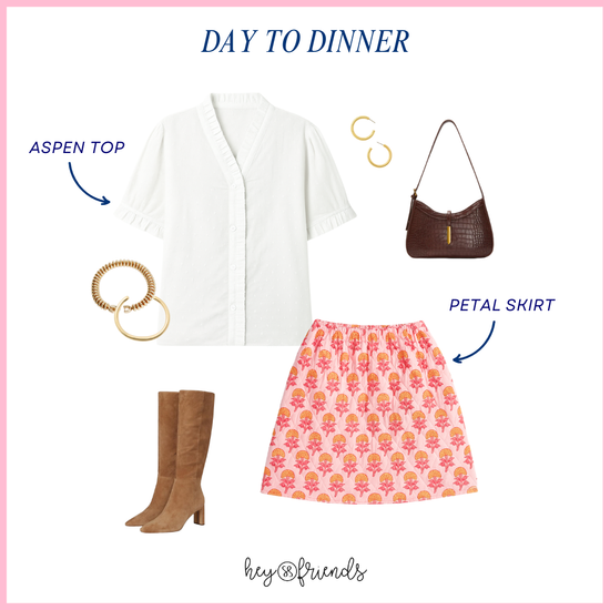 The Aspen Top is my go-to “elevated basic.” The cotton dobby fabric gives it that beautiful, subtle texture that reads special without trying too hard. I wear mine with denim on busy days, and I love it layered under the Marigold Jacket or paired with the Petal Skirt when I want something a little more polished. I wear a size Small for reference.