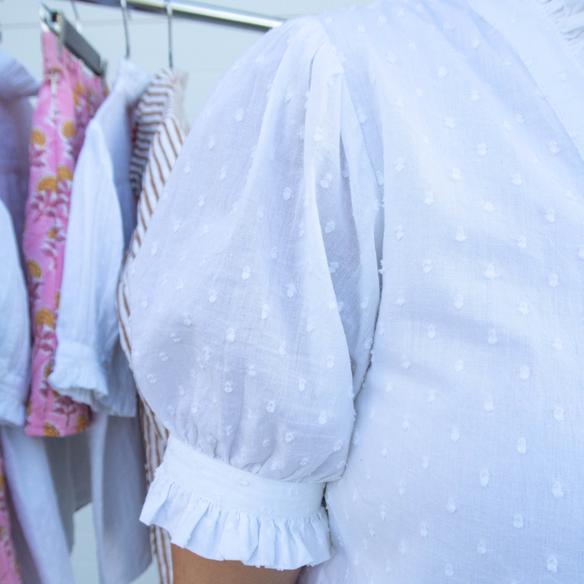 Subtle ruffle trim at neckline and cuffs