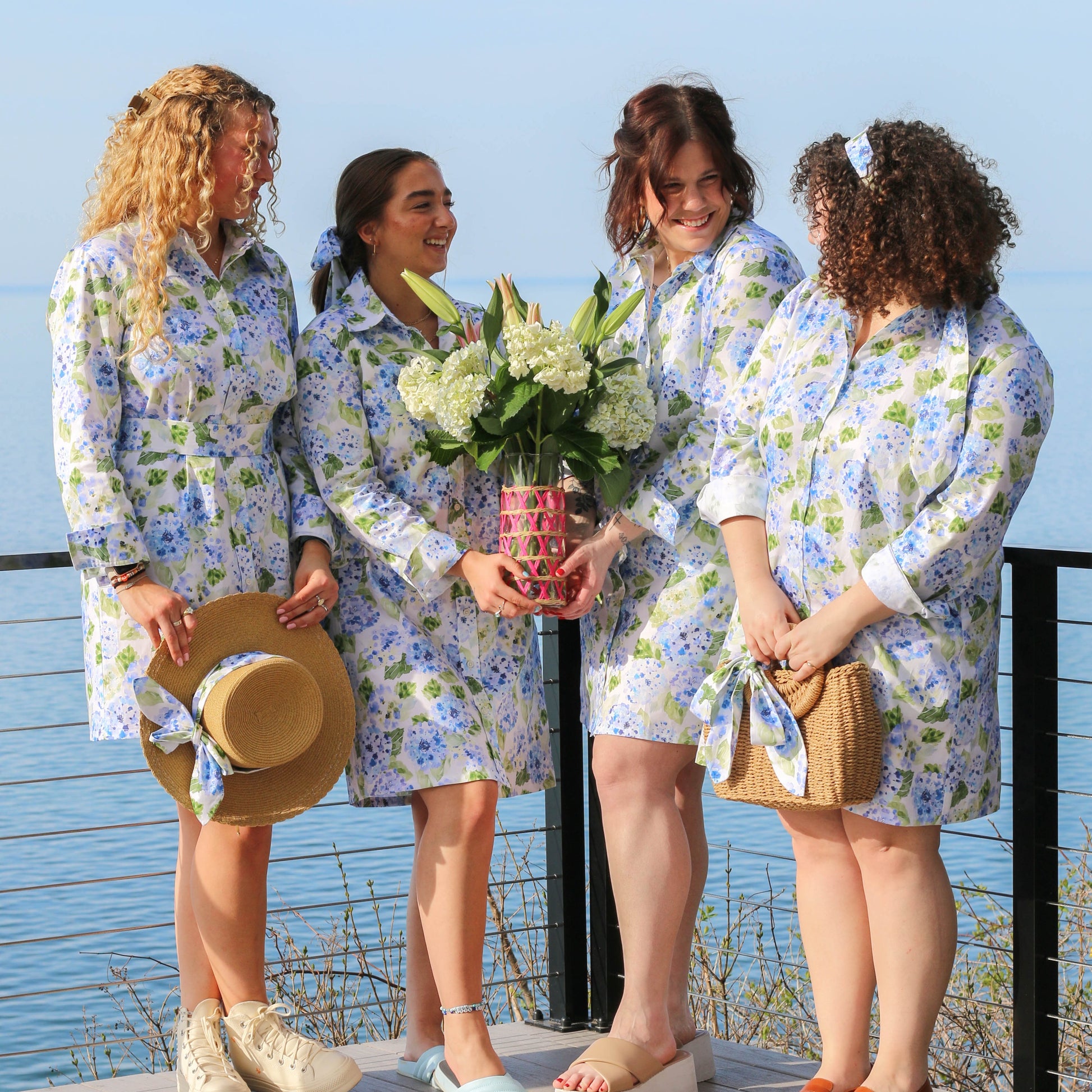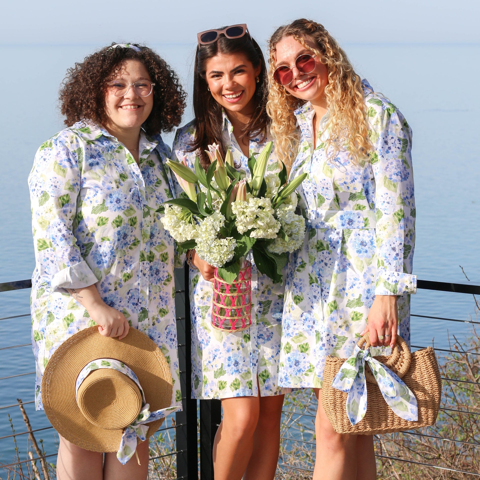 This is Shaef's newest release from Hey Friends The Label. This shirt dress is proudly made in the USA. This collared shirt dress fits true to size, Shaef wears the small. This dress features organic cotton and has pockets. This hydrangea fabric is beyond dreamy. You will be reaching for this dress in your closet all summer long.